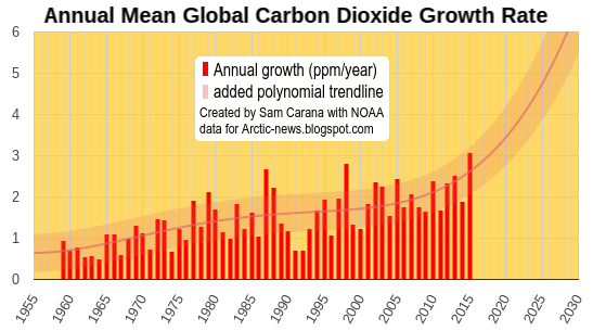 Rise 2016-2026: If levels of carbon dioxide and further greenhouse gases do keep rising, there will additional warming over the next ten years. Even with dramatic cuts in carbon dioxide emissions, temperatures can keep rising, as maximum warming occurs about one decade after a carbon dioxide emission, so the full wrath of the carbon dioxide emissions over the past ten years is still to come. Moreover, mean global carbon dioxide grew by 3.09 ppm in 2015, more than in any year since the record started in 1959, prompting an earlier post to add a polynomial trendline that points at a growth of 5 ppm by 2026 (a decade from now). This growth took place while global energy-related CO2 emissions have hardly grown over the past few years, indicating that land and oceans cannot be regarded as a sink, but should be regarded as source of carbon dioxide. On land, carbon dioxide may be released due to land changes, changes in agriculture, deforestation and extreme weather causing droughts, wildfires, desertification, erosion and other forms of soil degradation. Importantly, this points at the danger that such emissions will continue to grow as temperatures keep rising. New studies on permafrost melt (such as this one and this one) show that emissions and temperatures can rise much faster in the Arctic than previously thought. Furthermore, a 2007 study found a 25% soil moisture reduction to result in 2°C warming. Altogether, the rise over the next decade due to such emissions may be 0.2°C or 0.36°F (low) to 0.5°C or 0.9°F (high).